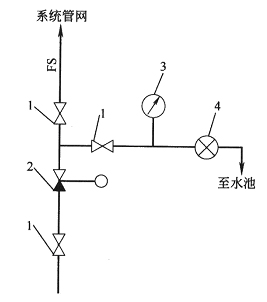 4 在報警閥與管網之間的供水干管上,應安裝由控制閥、檢測供水壓力、流量用的儀表及排水管道組成的系統流量壓力檢測裝置,其過水能力應與系統過水能力一致;干式報警閥組、雨淋報警閥組應安裝檢測時水流不進入系統管網的信號控制閥門。
